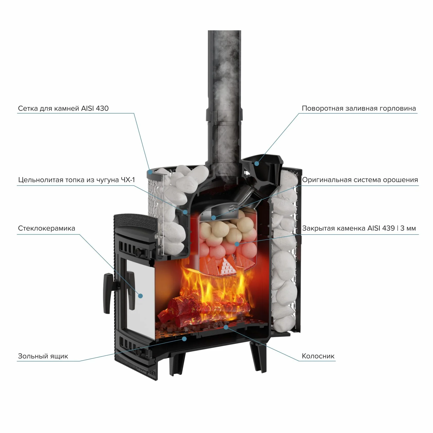 Подача воздуха для горения разделена на верхнее и подовое отверстия, а также дополнительно обеспечивается колосниковая решетка, что способствует эффективному тлению и экономии топлива. Внутри закрытой каменки вода подается через специальную воронку пушки, дозировано попадая на раскаленные камни и создавая насыщенный пар, который выходит через отверстие горловины. Открытая каменка может быть выполнена в различных стилях: облицована ламелями, натуральным камнем, сеткой или в комбинированном варианте, что позволяет гармонично вписать печь в любой интерьер.